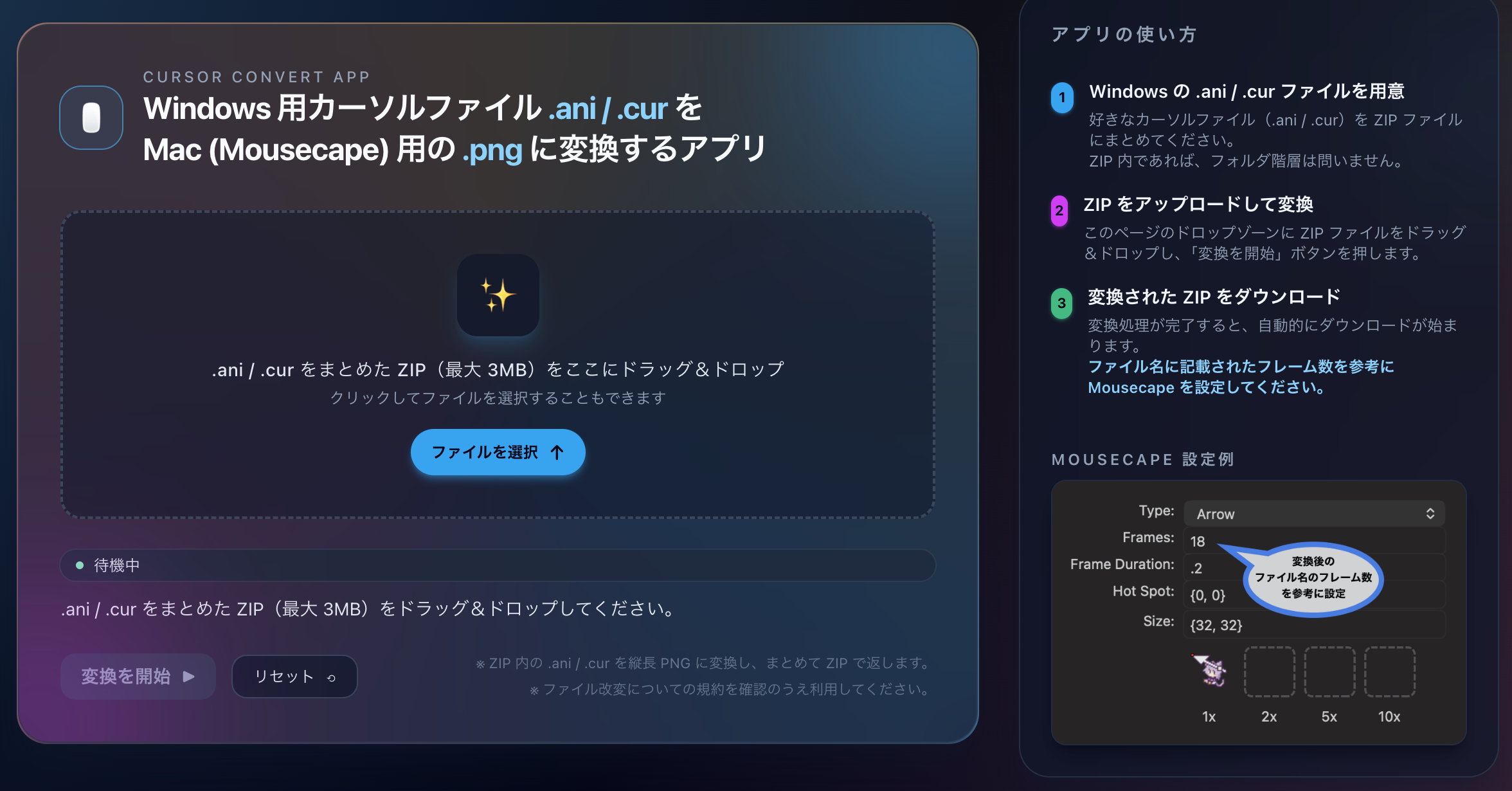 単にzipにまとめたani/curファイルをMousecape用のpng形式に変換し、zipにまとめ直して返すだけです